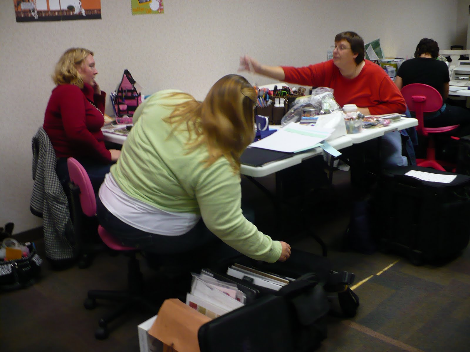 We ended the night with the drawing for the trifecta prize! Heather Bellin held the winning ticket. Thanks to Ramon for being such a good sport when I put him on the spot to do the drawing in front of some very anxious ladies. Heather won the kit and kaboodle of paper crafts, an album kit, a journal kit, and a card kit, with full instructions on DVD and all materials. Other prizes awared throughout the day, making for some very happy croppers.